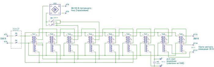 Вход защищен сдвоенным автоматом на 25 А. От одного такого трансформатора может питаться токарный станок, сверлильный станок, а также прочие станки, которые, возможно, появятся в будущем. От отводов трансформатора также берется напряжение 30 и 45 В, которое затем выпрямляется и его предполагается использовать для торможения двигателя постоянным током. Тумблером можно выбрать напряжение или 30 или 45 В, соответственно меняется скорость замедления ротора. От маломощных обмоток двух трансформаторов, соединенных последовательно предполагается питать светодиодную лампочку на 36 В для местного освещения, а от оставшейся маломощной обмотки запитать лампочки индикации. Вот примерная схема.