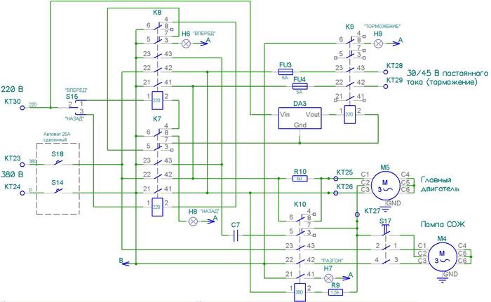Кстати, в этой схеме цепи управления пускателями питаются от 220 В, соответственно, сами пускатели с катушками на 220 В. Только пускатель, который срабатывает от третьей фазы, должен быть на 380 В. Если есть в наличии пускатели на 380 В, тогда цепь 220 В можно подключить к цепи 380 В.