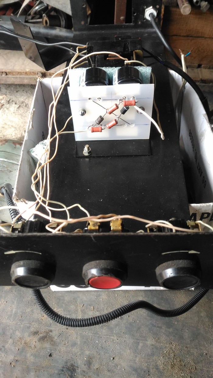 Для работы на переменном токе такие пары включаются встречно последовательно и шунтируются защитными диодами. При положительной полуволне работает один конденсатор, при отрицательной – другой. Высокоомные резисторы служат для разрядки батареи после снятия с нее напряжения и для выравнивания потенциалов. Такая схема подойдет для сверлильного станка. Вот она в собранном виде.