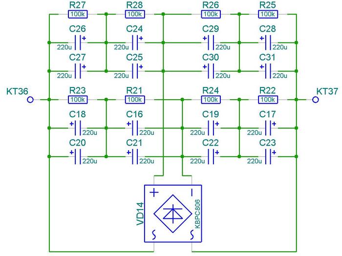 Пара слов о пусковой емкости. Для пуска двигателя станка необходима достаточно большая емкость и на достаточно высокое напряжение, не менее 650 В. Набирать такую емкость из советских металлобумажных конденсаторов не очень удачная идея, особенно если их нет под рукой. Такая батарея займет огромный объем и влетит в хорошую такую копеечку. Современные пусковые конденсаторы более малогабаритны, но также способны пробить хорошую брешь в бюджете. Очень привлекательным вариантом является использование полярных (электролитических) конденсаторов. Они имеют высокую емкость при небольших габаритах. Их можно, например, относительно бесплатно надергать на платах старых ламповых мониторов, телевизоров и любой другой техники, имеющей импульсный блок питания и большую «сетевую» емкость после выпрямителя. Правда, максимальное напряжение у них обычно 400 – 450 В, поэтому для работы в цепях 380 В мне их придется включать 2 шт последовательно. Например, так.