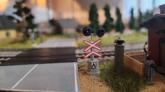 Как обычно, сила макета – в детальности. У переезда стоит женщина-железнодорожник, в лесу – егерь, на платформе – люди, а у дороги – дорожные знаки.