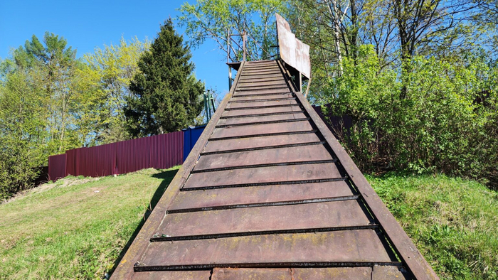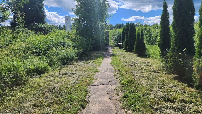 Пока мы остановились в магазине, затаривая будущий обед, я замечаю небольшую стеллу в кустах. Красная звезда манит, следую по старой асфальтовой тропке и нахожу небольшой мемориал (56.632167, 37.293240), которого нет на Яндекс-картах. Даже всемогущая Викимапия не может ничего рассказать! Судя по табличке, это памятник работникам темповских гидросооружений, павшим в боях Великой Отечественной Войны.