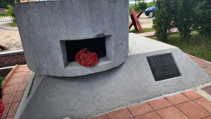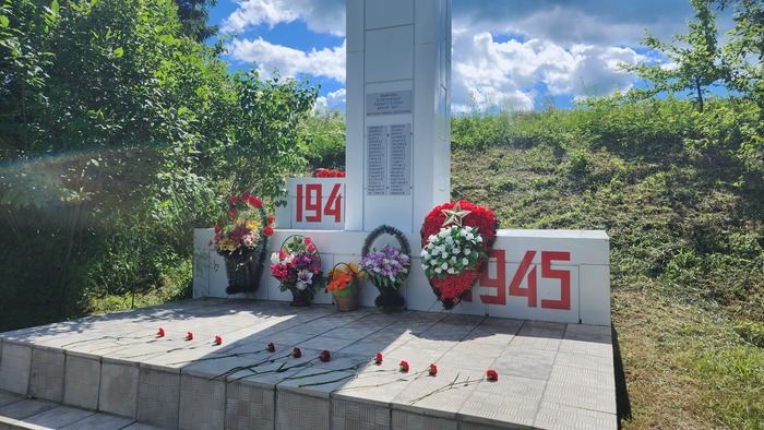 И, казалось бы, небольшой мемориал в кустах, а не забыт. Установлены венки и даже гвоздики настоящие, не бутафория.