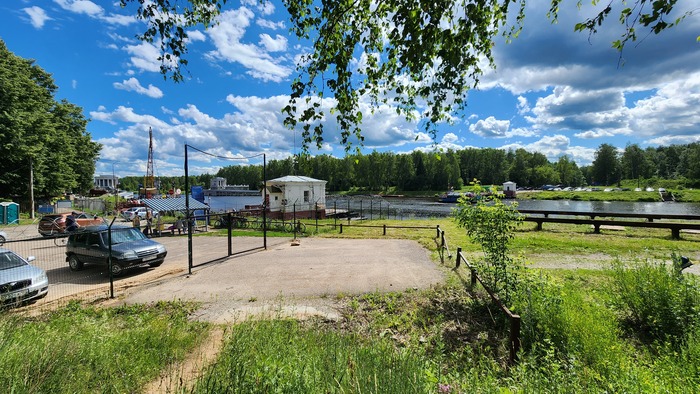 На переправе работает паром (56.714481, 37.134221), неспешно таская желающих туда-сюда. Желающих много, они выстраиваются в очередь вдоль Лебяжьего озера и недовольны тем, что я хочу пробраться на парковочное место, которое они закрыли. А ещё у меня за спиной Большой Волжский маяк, из-за нехватки времени к нему мы не пошли.