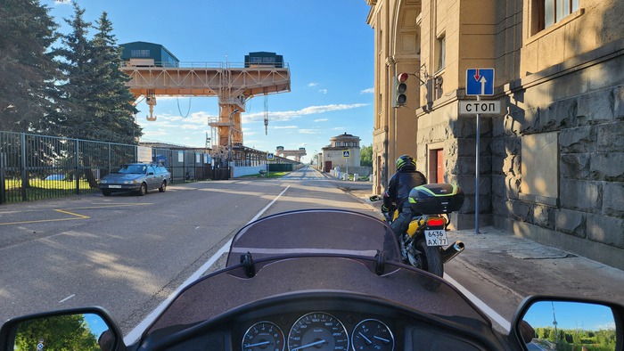 Все мотоциклы оставлены на парковке, один уникум решил подъехать ради фото. Осуждаю такое поведение, но это единственное фото, что я додумался сделать. Ленин - величественнен. Он доминирует над окружением, взирая вдаль, на стрелу канала. Высота - 25 метров, с постаментом 37, это второй по высоте памятник Ильичу. Источники говорят, что на противоположном берегу был установлен памятник Сталину, но после разоблачения "культа личности" был снесён.