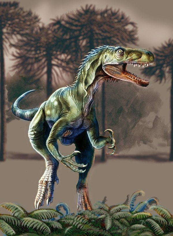 В западной Гондване, где теперь находится Аргентина, обитал самый древний известный динозавр – эораптор. Это был небольшой хищный или всеядный динозавр, достигавший метра в длину. Он настолько примитивно устроен, в сравнении с другими динозаврами, что исследователи затрудняются отнести его к какому-то одному подотряду динозавров. Его помещали в зауроподоморфов, которые спустя миллионы лет вырастут в гигантов диплодоков и брахиозавров, и в тероподов, потомки, которых стали птицами.