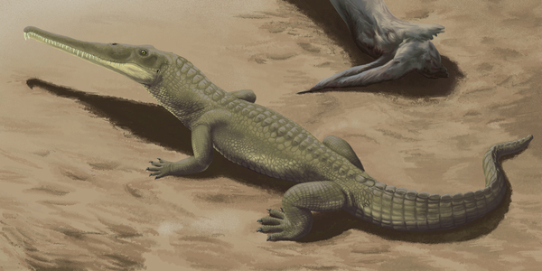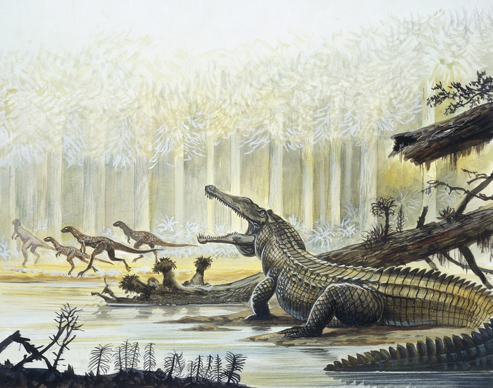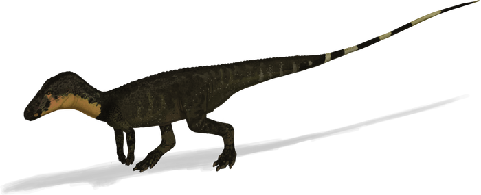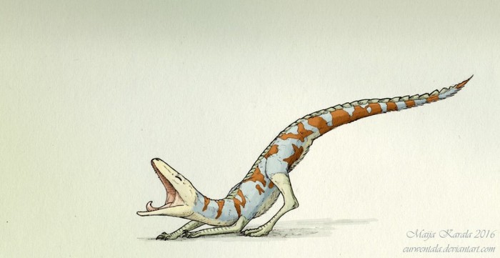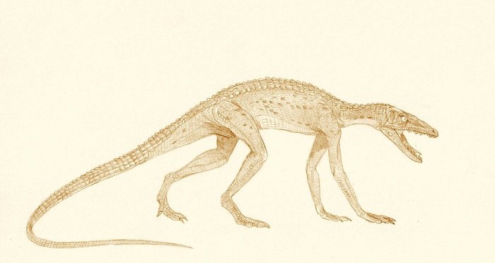 Речь пойдет о сфенозухиях — изящных наземных крокодиломорфов, живших с позднего триаса до ранней юры. Это были самые примитивные представители надотряда крокодиломорфов и предки всех современных крокодилов. Сфенозухии обладали легким скелетом и отлично бегали. Большинство из них перемещались на четырех ногах, но некоторые были способны к бегу на своих двоих.