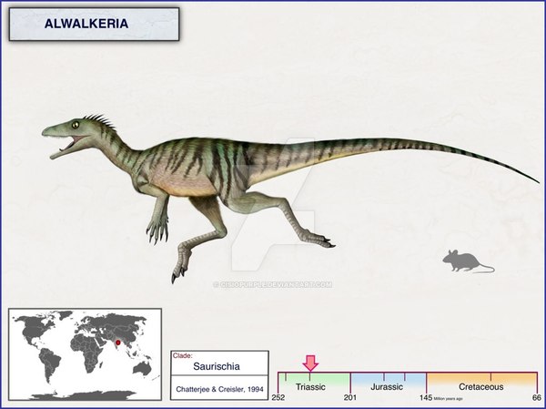 Альвалькерия - род всеядных динозавров карнийского яруса верхнего триаса. Из-за большой нехватки скелета оценки габаритов скачут от 0,5 до 1,5 метров. На удивление, малыш был родом из Индии.