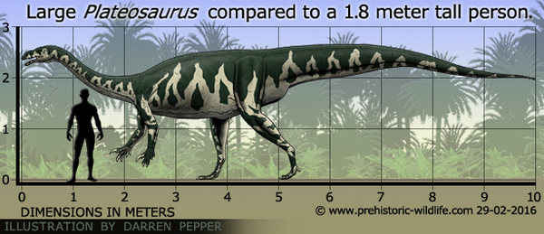 Платеозавр (широкий ящер) жил в то же время, но не в Южной Африке, а на территории современной Европы. В отличие от меланорозавра, платеозавр ещё не освоил четырёхногое хождение и чаще передвигался исключительно на задних лапах. При этом, он превосходил своего африканского собрата по весу в 3-4 раза! Платеозавр имел более плотное телосложение. Его скелет хорошо известны учёным, ведь было найдено с полсотни мест обитания этого исполина.