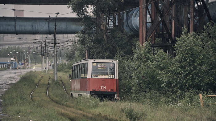 Проходя возле бесконечных цехов слышен очень громкий и вездесущий гул от выходящего ото всюду пара. А слева в это время шумит трамвай на путях.