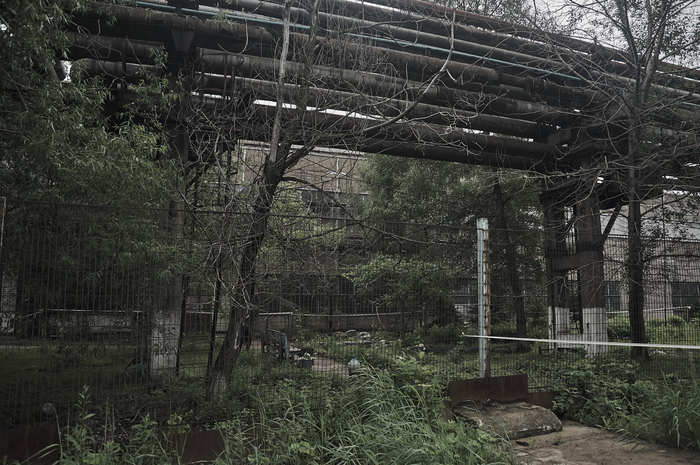 Интересный момент: под магистралью из труб стоит себе уютный дворик на территории предприятия. Цветы в горшках, разные растения... А над головой техногенность..