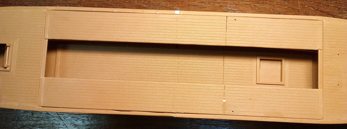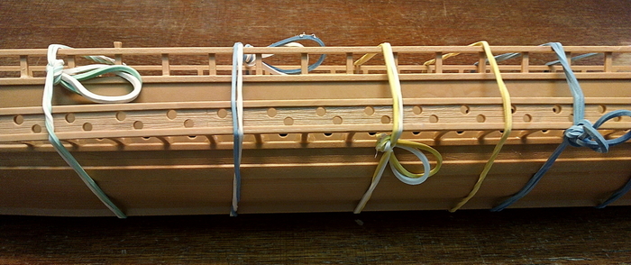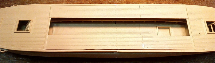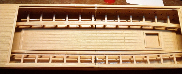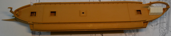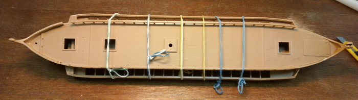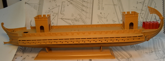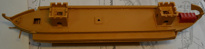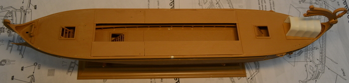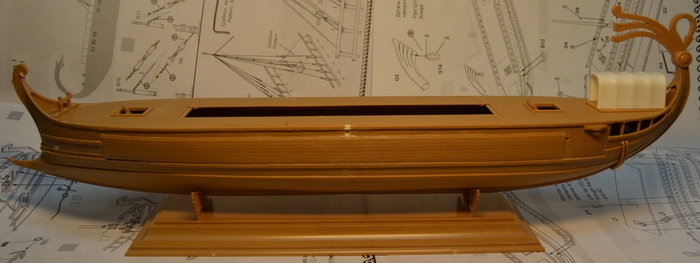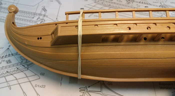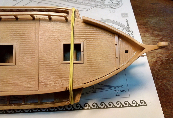 Отдельно дорабатываем укороченную галеру. Так как у нее боковых площадок для гребцов не будет, делаем из "лишних" деталей имитацию гребных банок внутри корпуса.