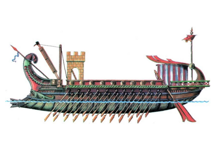 Это боевой корабль с тремя рядами вёсел, на двух вёслах сидело по два гребца, на одном – один, всего пять. Расположение в пять рядов никто уже просто в здравом уме не рассматривает. Число весел в одном ряду доходило до 25, водоизмещение свыше 200 т, длина 45 м, ширина 6 м, осадка 2,5 м, экипаж около 250 чел. Для согласования гребли применялись канатное соединение вёсел одного ряда и упоры, ограничивающие величину гребка. Вооружались восемью камнемётами, имели по 300 морпехов и их построили в разных модификациях 500 шт.
