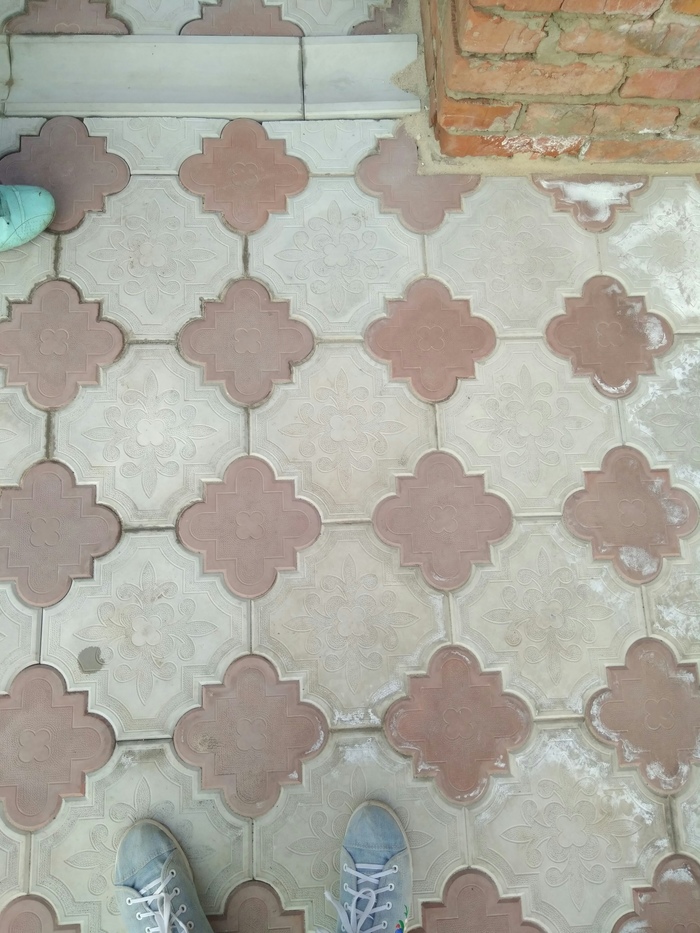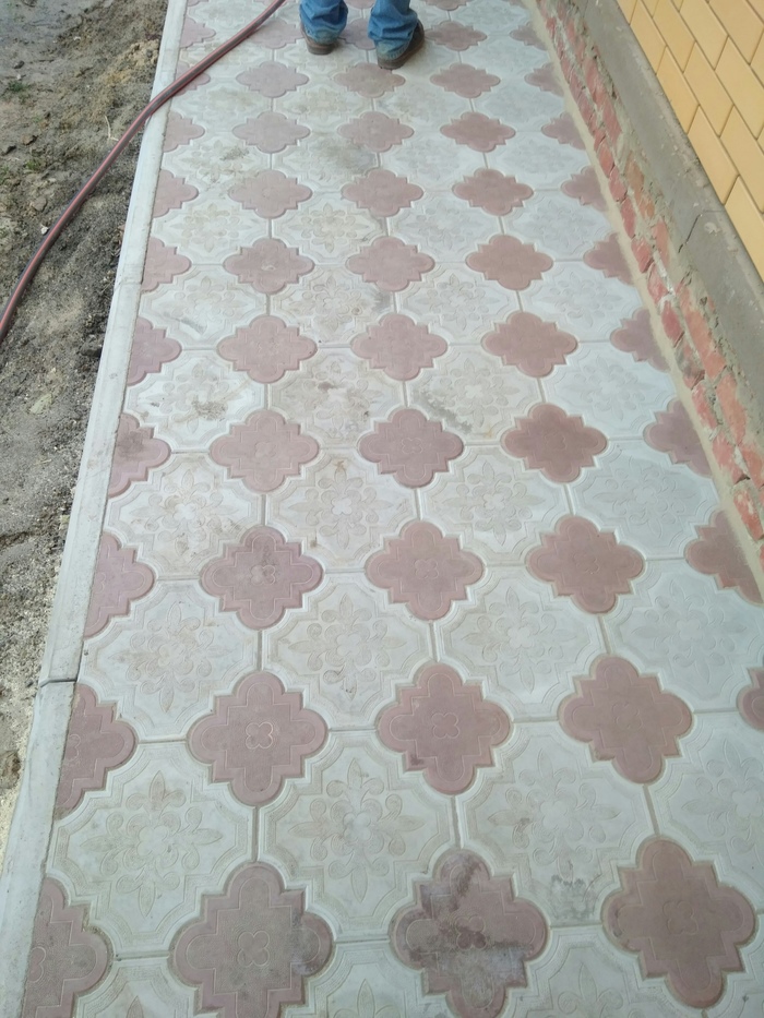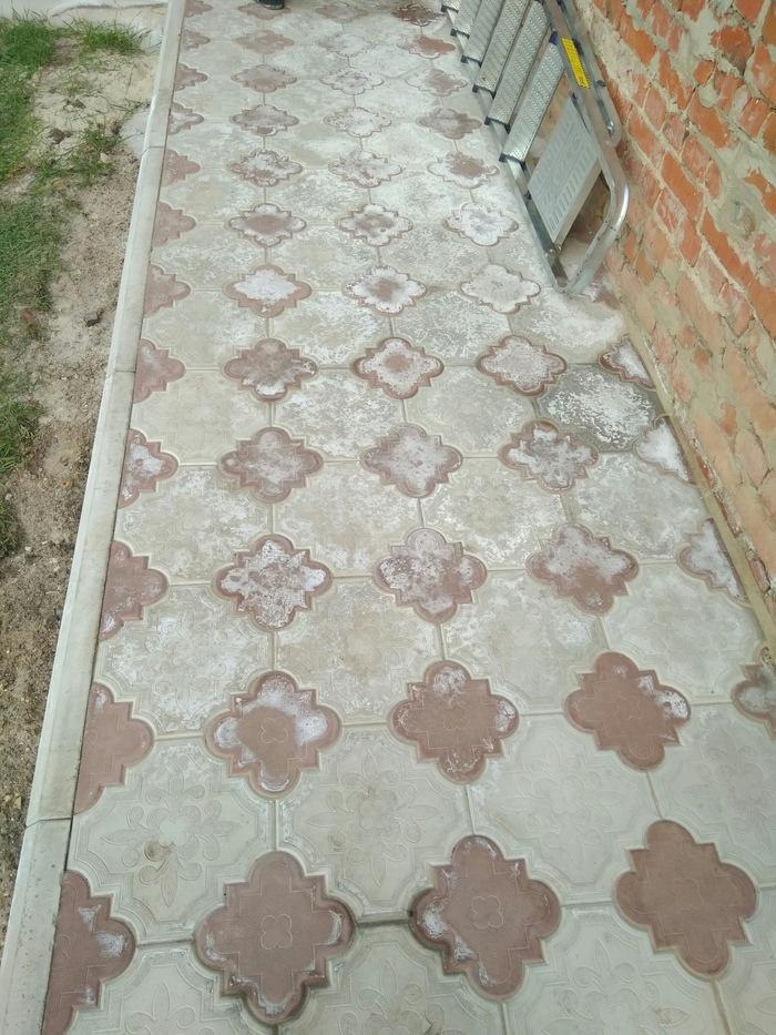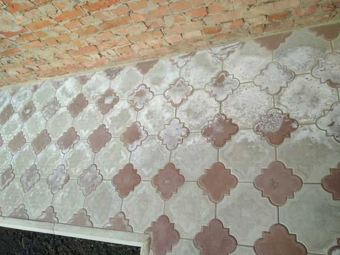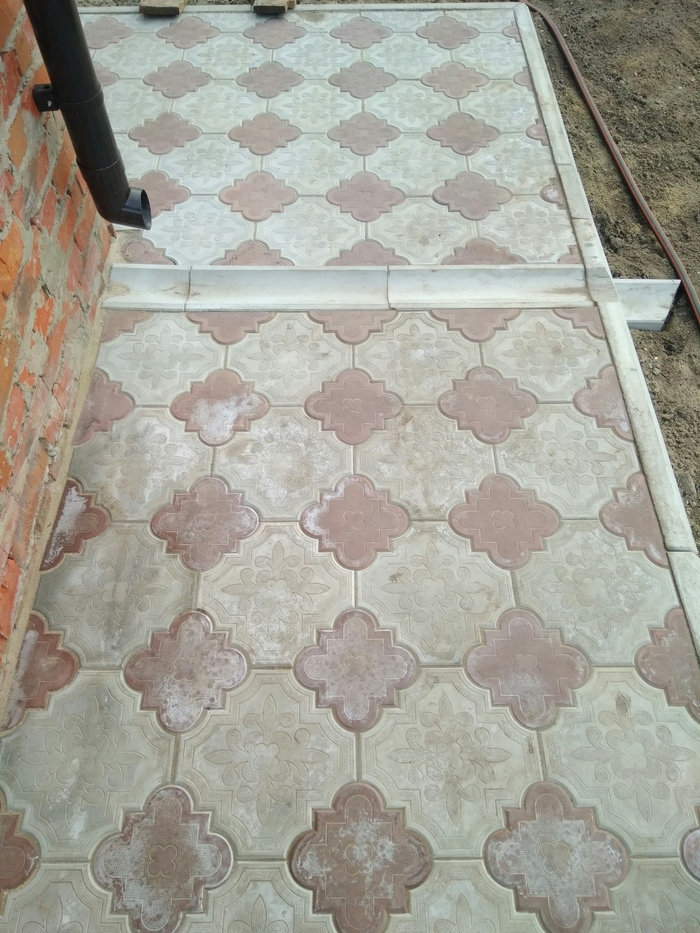 Начали привозить поддоны с плиткой - светлую и со следами влаги, полностью высохшую и по виду недавно сделанную. Указал на данные особенности - получил ответ прораба - всё просохнет, всё будет одинаково.Присутствовать и проконтролировать не получилось - та же успокоительная речь, что всё будет в "лучшем виде". Выложила бригада быстро, всё что было - целую и треснутую, со сколами и тёмными пятнами. После указания на ошибки, часть плиток была заменена. Но прошёл первый дождь и пошли языки так называемых "высолов", причем они не равномерно покрывали площадь укладки, а частями. Например, с правой стороны дома, отмостка была вся как-будто в снегу, центральная дорожка к дому- почти не заметно,