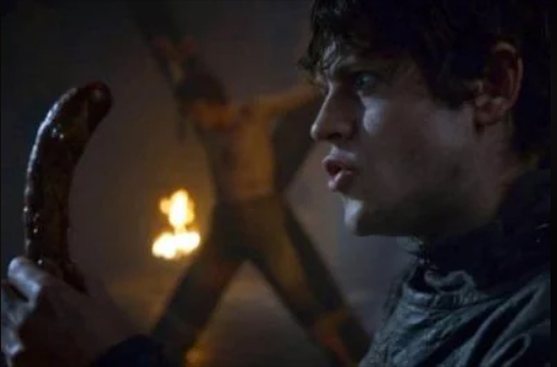 Во второй сцене Ахилл тащит привязанное за ноги тело Гектора, стоя на колеснице: