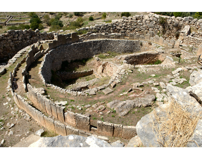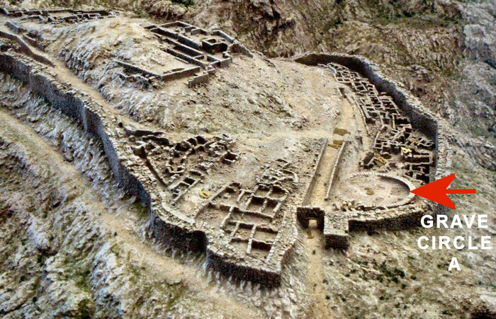 Могильный круг А, расположенный неподалеку от Львиных ворот Микен, являлся королевским кладбищем XVI века до н. э. Изначально располагался вне стен, но в XIII веке до н. э. был включен в них в результате расширения Микен. Среди сокровищ, здесь обнаруженных, помимо золотых посмертных масок, были найдены различные ювелирные изделия, пряжки, диадемы из золота, серьги, изысканные посохи, оружие и даже весы, судя по всему, которыми «взвешивали души» как на суде Осириса. Всё это свидетельствует о том, что здесь хоронили правителей и членов царствующей семьи.
