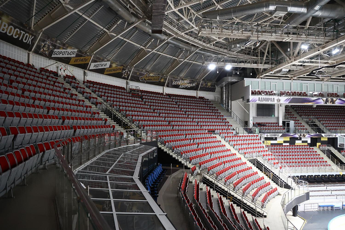 Посреди арены есть аквариум — «Адмиральский клуб». Это не закрытая ложа, а общая зона на 24 места, куда можно купить отдельный билет. Там есть свой бар, диванчики, и можно оказаться за столиком с незнакомыми людьми.