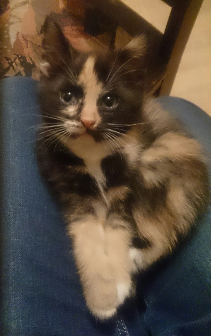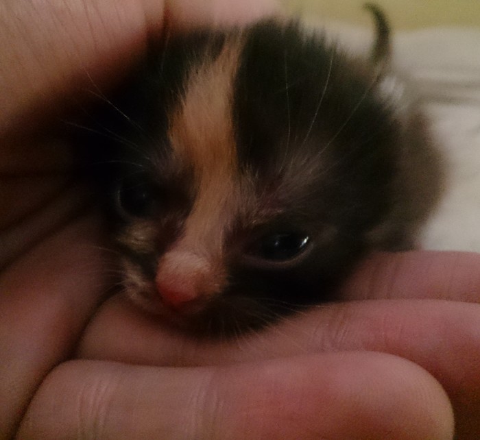 Кошку мы решили оставить, после ночных выкармливаний мы уже не могли с ней расстаться. Придумывали ей имя и все сложилась само собой. Родилась третьего октября, ТРЁхцветная коШКА. Трёшка. Так и назвали кошка Трёшка.