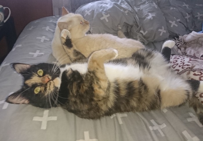 Гренка же, в свою очередь, отличалась крайним доверием к нам, поэтому периодически притаскивала мелкую к нам на кровать: то покормить, то умывать, то просто под бочок, пока пойдёт на кухню по делам. Поэтому пришлось ещё и спать аккуратно.