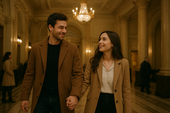 С первых же шагов по-театральному фойе Анастасия почувствовала себя туристом в незнакомой стране. Она сама здесь не была лет пять и с трудом вспоминала планировку. Алексей же вёл себя как коренной житель. Он уверенно провёл её мимо гардероба, ловко обогнул очередь в буфет и без единой запинки свернул к нужному входу в зал.