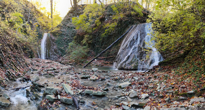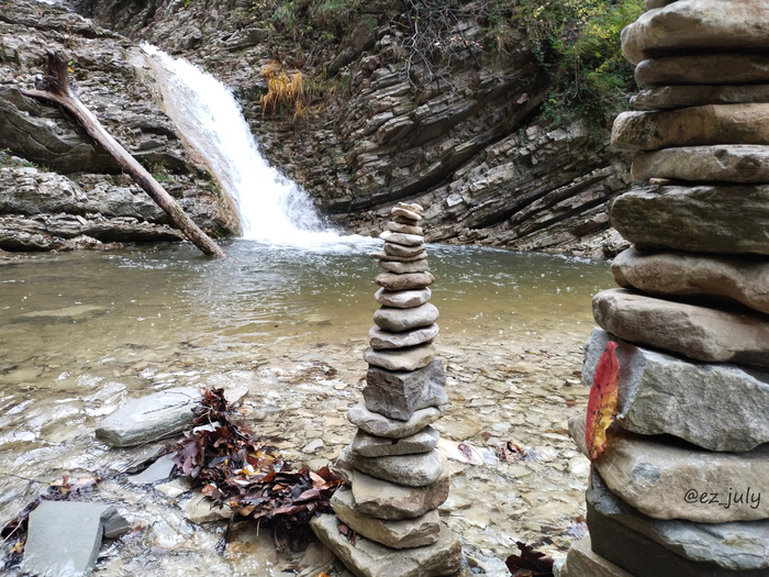 Клацая зубами, я выбралась на берег по ту сторону. И это было ОНО! То самое место, которое отвечало моим эстетическим требованиям. Широкая каменистая площадка, на которую сходятся русла двух ручьёв, обрываясь полноводными водопадами метра по 3 каждый. Восторгу моему не было предела.