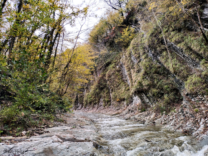 Слабая, еле заметная тропинка вела среди зелёных замшелых камней, ярко-оранжевого подлеска, пихт и гигантских грабов, спускаясь прямо в узкое, тёмное ущелье. Отвесные каменные стены тут уходят вертикально вверх метров на 15, по дну ущелья стекает тонкая струйка воды. Трудно поверить, что это начало той самой реки, которая питает несколько крупных посёлков, Горячий ключ и Краснодарское водохранилище.