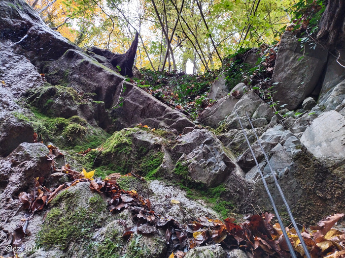 По-хорошему, там надо идти с напарником, альпинистскими обвязками и нормальной верёвкой метров 50. Мой спуск представлял из себя плачевное зрелище с использованием веток и репшнура.