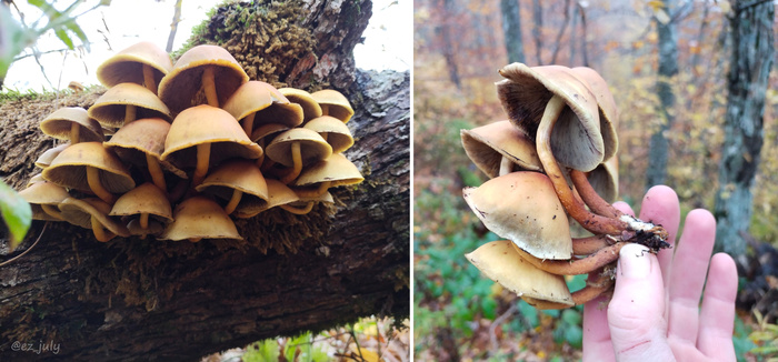 Наконец-то встретила знаменитую галерину. Это ядовитый двойник фламулины (опёнка). Правда, без кольца - возможно, какая-то