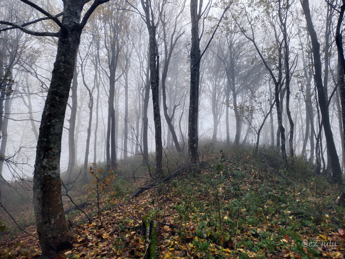 Вершина горы Букепка. Фотографировала просто лес, но прямо в центре из тумана выглядывает триангулятор (металлическая конструкция, обозначающая геодезическую вершину). Заметила только когда писала этот пост