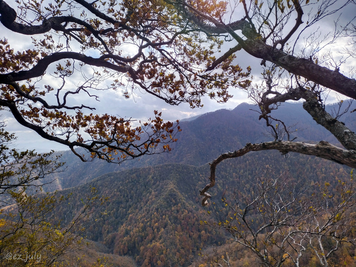После Тамзая я поняла, что дождливый ноябрь – не самое удачное время для спуска по водопадам и каньоны Цыпки и Таштая (в народе – Бешенка) решила обойти по хребтам. Лес тут довольно мрачный в это время