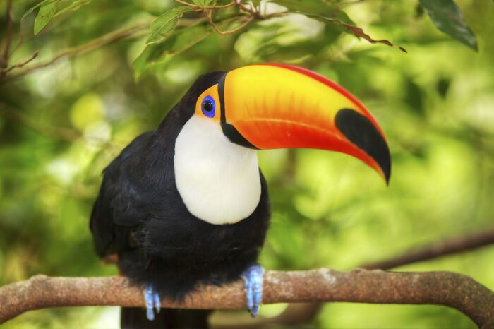 Тукан — одна из самых узнаваемых птиц Амазонки. Его клюв кажется совершенно непрактичным — почти половина длины тела! Но на самом деле он очень лёгкий: внутри — не кость, а структура, похожая на пену, наполненную воздухом. Такой клюв помогает тукану доставать фрукты с дальних веток, а ещё служит… кондиционером. Он регулирует температуру тела, как уши у слона. И да, несмотря на размеры, тукан — отличный лётчик. Просто иногда кажется, что клюв летит чуть раньше птицы. Яркая окраска помогает ему отпугивать хищников и одновременно привлекать партнёров — идеальное сочетание пользы и стиля.
