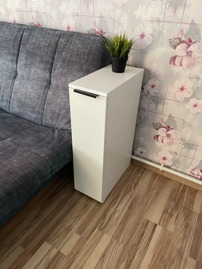 Интересная выдвижная узкая тумба для гостиной, кухни, туалета или ванной комнаты. Не занимает много места. Очень удобно хранить различные вещи и чистящие средства. Стоит такая около 3300 руб. Ссылка на неё