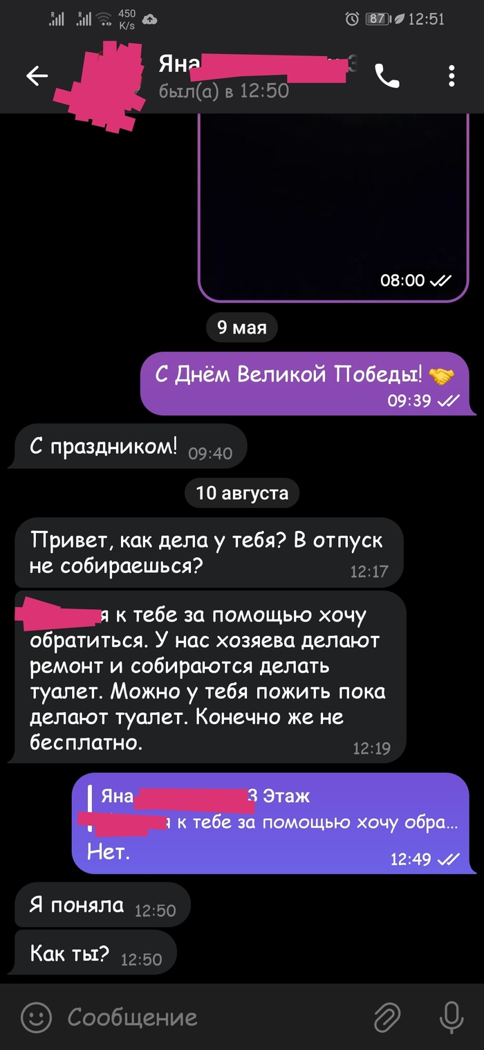 А сегодня мне пишит соседка, с моего дома, которая снимает квартиру в оном же. Бухает она знатно, всяких полубомжей к себе таскает, дочка у нее лет 12 с явными психическими отклонениями - истерики, резкие движения, нарушение координации движений. Я не говорю о ее внешнем виде это жопа. Можно я у тебя поживу пока хозяева делают ремонт? Нет, нельзя! Ты кто такая чтоб у меня жить? Это моя квартира, моя крепость, там мои личные вещи - трусы, носки, одеяла, подушки, документы, техника которая денег стоит, моих трудов, эмоций и мыслей! Это мой дом, ключей от него нет даже у моей девушки, которая на текущий момент забрала моего кота к себе и ухаживает за ним в моё отсутствие. А если ты что то сломаешь, а если ты устроишь пожар, потоп? Ты чем будешь расплачиваться? Мне твоя тушка с центнер весом и мохнаткой не нужна! В гостиннице поживи ёптель!