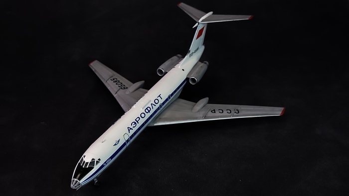Но к счастью, судьба распорядилась так, что я планах появилась изкоробка Ту-134А в ливреи советского аэрофлота. Отличительной особенностью данной модели является то, что она собирается за один вечер. Да и красится в общем то тоже за пару часов (краска едва поспевает подсохнуть, как аэрограф уже заправлен следующим цветом)