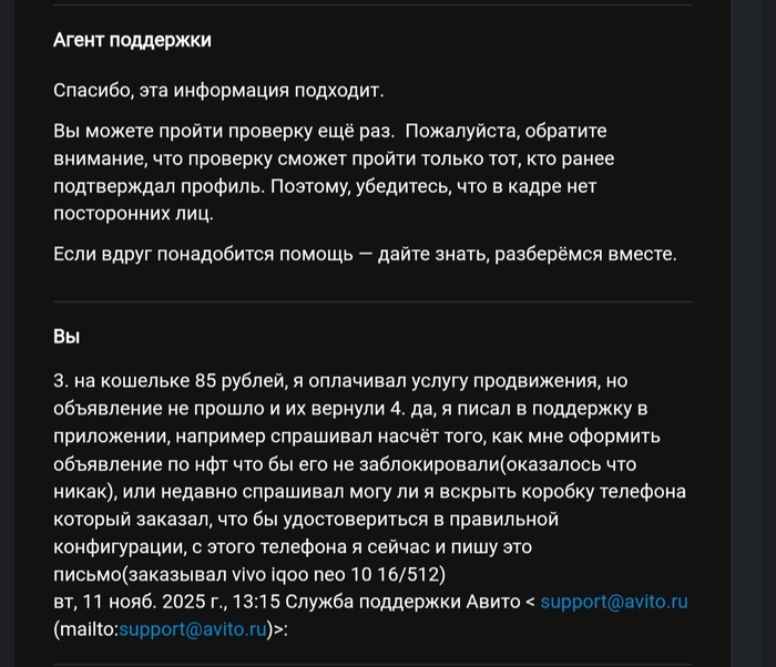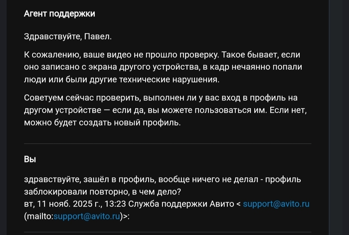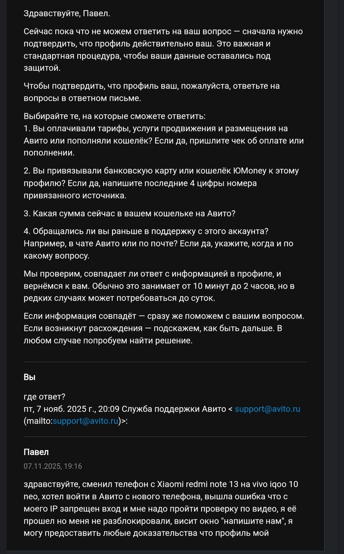 Ответил на стандартные вопросы, и, хотя было указано что я "могу пройти проверку по видео повторно" - профиль просто был разблокирован, соответственно я ничего не проходил и подумал что всё хорошо. День мониторил объявления которые мне были интересны, но абсолютно никаких действий не совершал, никому не звонил, не писал, не выкладывал объявлений и тд., однако к моему шоку через пару дней я захожу..нет, не захожу, профиль заблокирован повторно с призывом писать письма, и тут уже ахуй, сколько похуй и тупий: