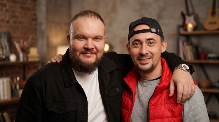 На этой фотографии вы видите творческий дуэт из Великого Новгорода: Михаила Голубева и Евгения Тодурова. Михаил – в своём привычном актёрско‑повседневном образе, а Евгений узнаваем по кепке и яркой красной жилетке, как человек, который привык быть в кадре и не боится брать на себя внимание.