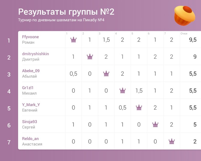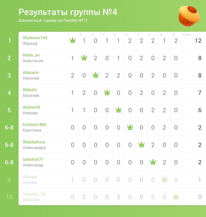 В этой группе сильнейшим оказался Никита (Nikkkitos). Сразу три оппонента пытались отобрать корону у Никиты, но, с перевесом в один балл, он доказал, что является лучшим. Поздравляем и желаем дальнейших побед!