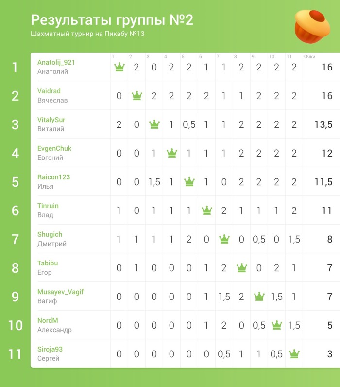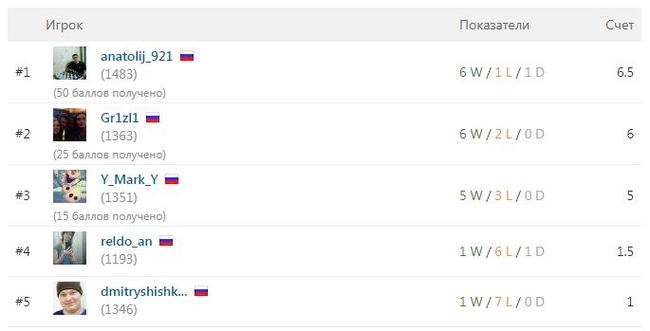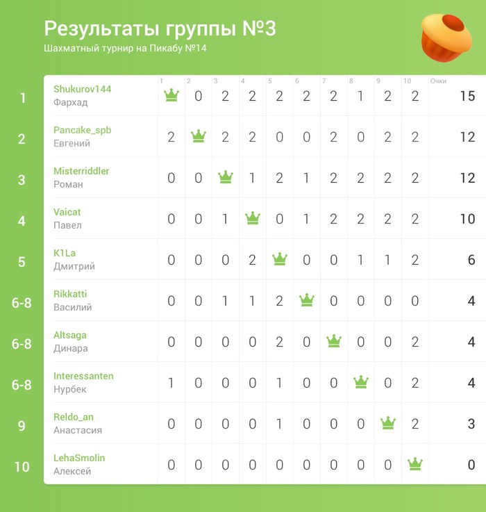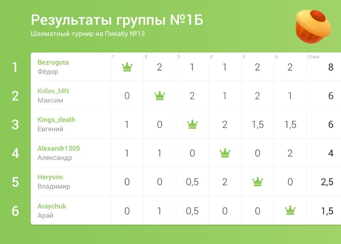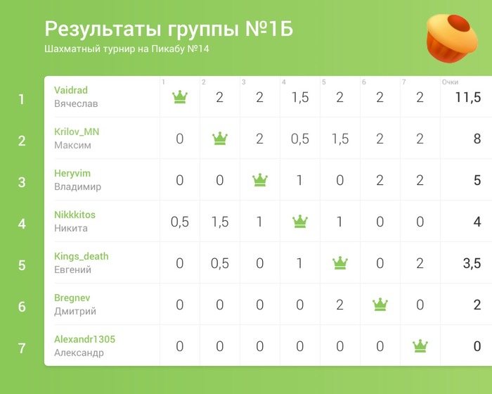 В первой группе отличился дебютант нашего турнира Николай (NickBystrov). Мы поздравляем Николая с отличным стартом и желаем новых побед в следующих турнирах!