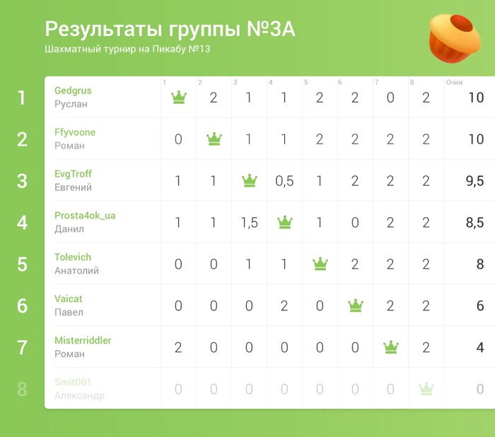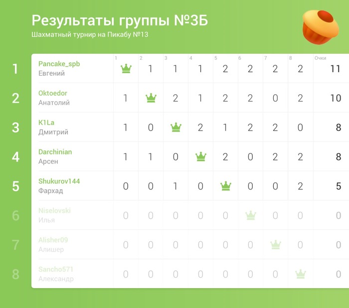 Напряженная борьба сложилась в данной группе. Участники до последнего боролись за призовые места. Никто не знал, кому это удастся. Никто, кроме еще одного дебютанта нашего турнира Дмитрия (Shugich). Дмитрий уверенно одерживал одну победу за другой и набрал 13 из возможных 14 баллов. Поздравляем с уверенным стартом!