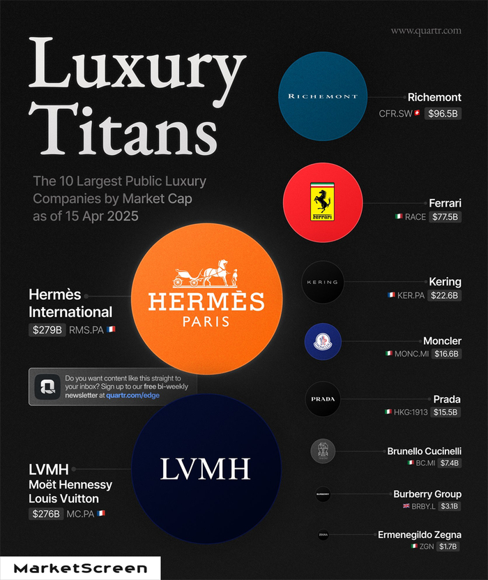 Если исходить из капитализации, что по состояние на 15 апреля 2025 года Hermes таки обогнал LVMH. 279 млрд $ против 276 млрд $. А где-то там далеко взади идут всякие Richemont, Ferrari, Kering и др.