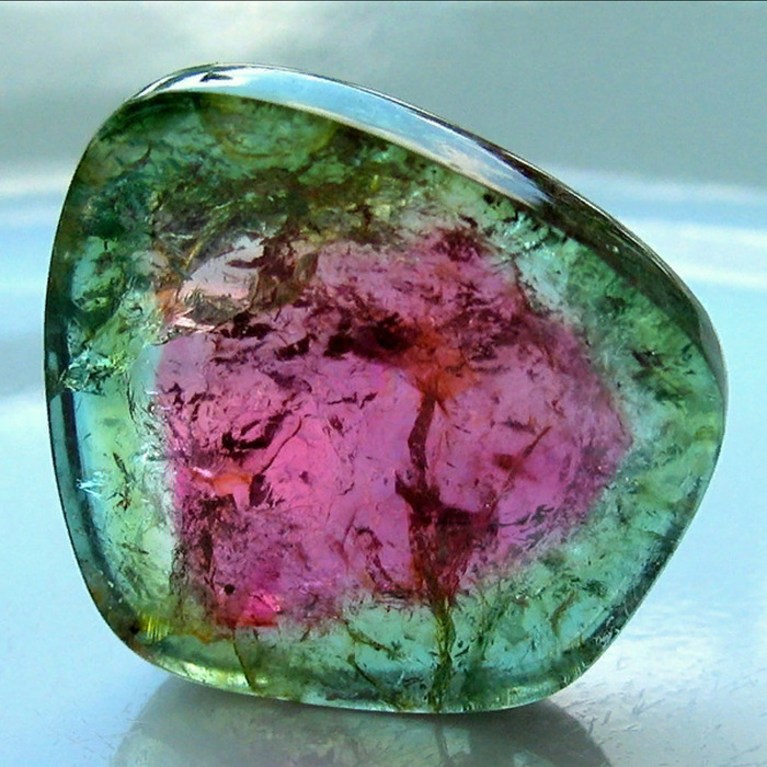 Как всем турмалинам, арбузному камню присущи стеклянный блеск, зональное распределение красок, неровный излом и хрупкость.