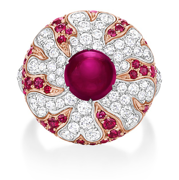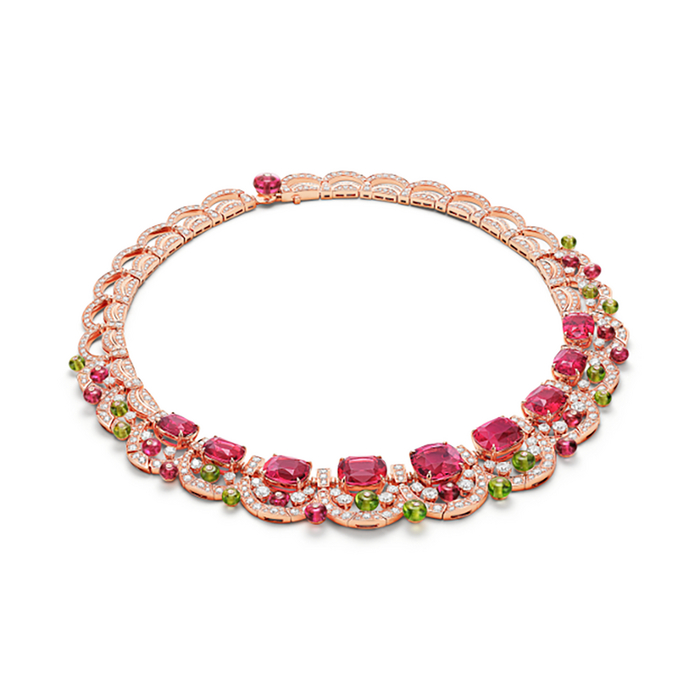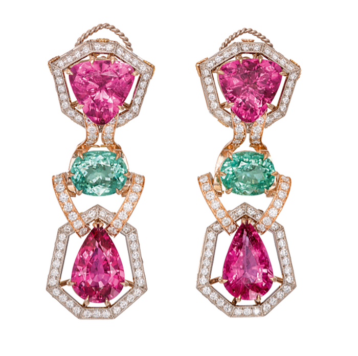 "Рубеллиты обладают исключительно насыщенным и бархатистым цветом, создавая прекрасный контраст с окружающими бриллиантами остальной части украшения." - говорят в доме.