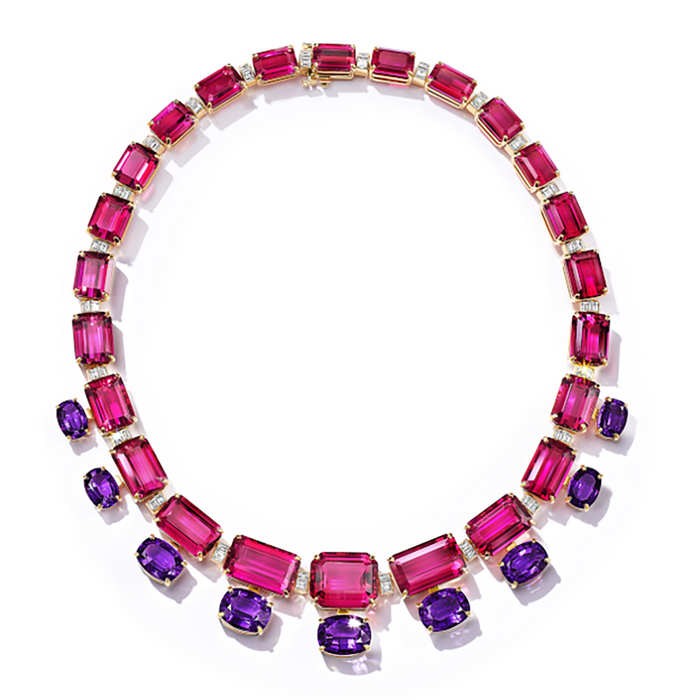 Смелое сочетание 24 рубеллитов изумрудной огранки общим весом более 124 карат и девяти аметистов огранки "кабашон" общим весом более 23 каратов делает это колье неописуемым. Бриллианты квадратной огранки общим весом более 5 карат разделяют каждый рубеллит, оживляя это колье из желтого золота 750 пробы".