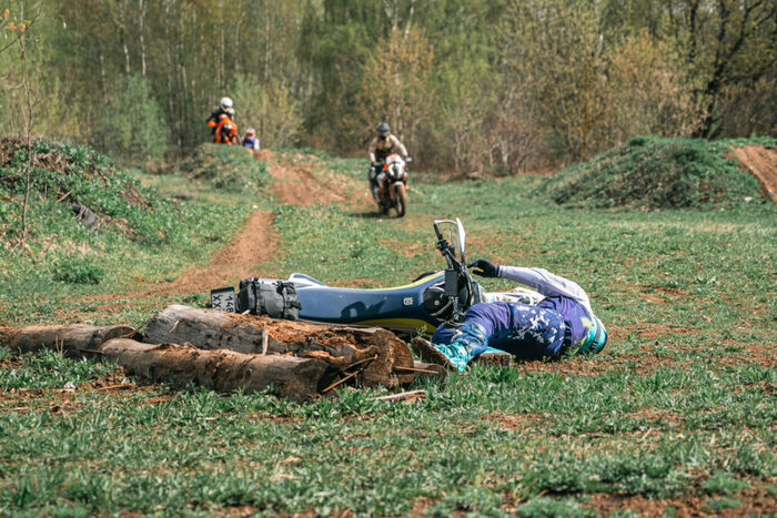 Не обошлось, к сожалению, без травм. На прокатном мотоцикле на сыпучем грунте один райдер упал и получил трещину в кисти. А в гонке уже другой райдер решил преодолеть мокрые брёвна под острым углом, из-за чего колесо соскочило а он неудачно приземлился на ногу.