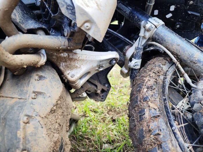 Падения на бездорожье – дело обычное. Разница появляется тогда, когда под вами не кроссовый мотоцикл весом 100кг а 200+ кг туристический эндуро. Падать тоже нужно уметь, при том что обычный мотоциклист падать не готов вообще. Ну как, готов конечно, где-то там, на подкорке. Но не в режиме “я за эту гонку упаду раза 4”.