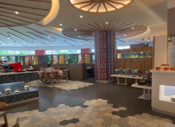 По еде скажу, что мы остались очень довольны и ассортиментом, и качеством, и количеством)) На шведский стол открыты 2 ресторана, один работает вообще 24 часа (в нем, кстати, всегда поменьше народу). Рестораны светлые, просторные, в главном нам понравилось завтракать на открытой террасе. В отеле бомбическая выпечка и хлеб, мы такого изобилия нигде не встречали. Ну и естественно, много салатов, заготовок для них, соусов, закусок; всегда есть пара супов, морепродукты, рис-макароны, картошка, курица-мясо-рыба, в общем, не буду дальше перечислять – с едой в отеле все хорошо. Естественно, на вкус и цвет товарищей нет, и какие-то блюда нам не очень зашли, от каких-то остались в восторге.