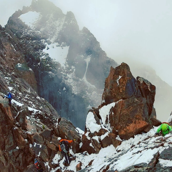 Решили идти вчетвером, заполнили маршрутный лист, собрались и легли спать. Утром, не имея, как обычно, аппетита и ввиду легкости маршрута, решил завтрак заменить легким перекусом, взял с собой литр чая и два сникерса. Один участник передумал идти еще утром, второй откололся на Альпинграде, а мы с Костей-инструктором решили все-таки двинуть на вершину. Выпавший накануне снег замел тропинки и следы (лавиноопасности не было). Ни я, ни Костя на этом маршруте еще не были, но подкупала достаточная простота маршрута. После подъема на перевал к началу маршрута на меня навалила усталость (хотя на Альпинград подозрительно легко забежал), ноги забились, видимо дала знать плотность графика смены. Но все равно решили, что пойду первым. Решили идти в темпе, поэтому на перевале сбросили все лишнее (как я пожалел потом об этом). Однако, благоразумие позволило мне не отказаться взять с собой рюкзак, запасные рукавицы и пуховку, само собой аптечку. Побежали дальше в связке, отказавшись от перил в пользу попеременной страховки на участках со свободным лазанием.