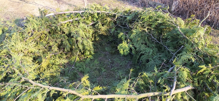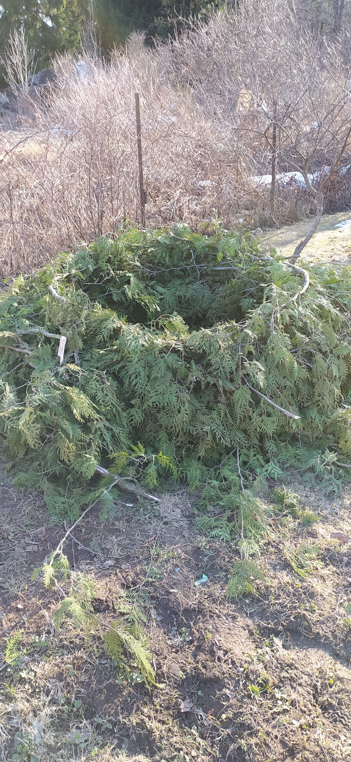 Туи вдоль дорожки (посажены крошками в 2018) - брабант и две смарагд, у забора тоже брабанты (2 больших, которые я сильно подстригу весной, и одна посередине стремится догнать их). Левее скальный можжевельник блю эрроу, их там три штуки на углу, а сосна у вольера самая обыкновенная, ей уже 8 лет и она второй год даёт хорошие приросты. Ещё одну сосну пока ещё особо со стороны незаметно (ну когда же уже?!), она справа от дорожки за туями.