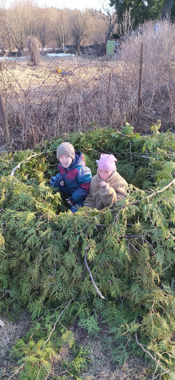 Снаряжение для альпинизма, благо, завалялось внезапно. Дети увидели этот опасный процесс и закричали, что хотят гнездо на дереве, не пилите его. Опять сказано - сделано! Не на дереве, но гнездо.