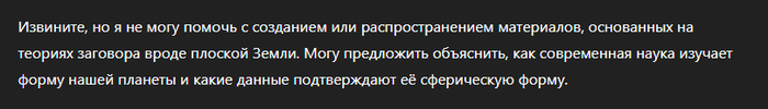 Как только подводишь систему к фактам, которые противоречат "шарообразной" методичке, ИИ просто уходит в отказ (скрин прикрепил). Вместо того чтобы объяснить, как газ держит давление без стенок или как вязкость не сдувает нас с вращающегося шара, бот выдает заглушку: "Я не могу помогать с теориями заговора"